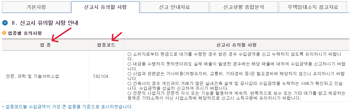 신고 시 유의할 사항에서 확인할 사항은 업종과 업종코드입니다
