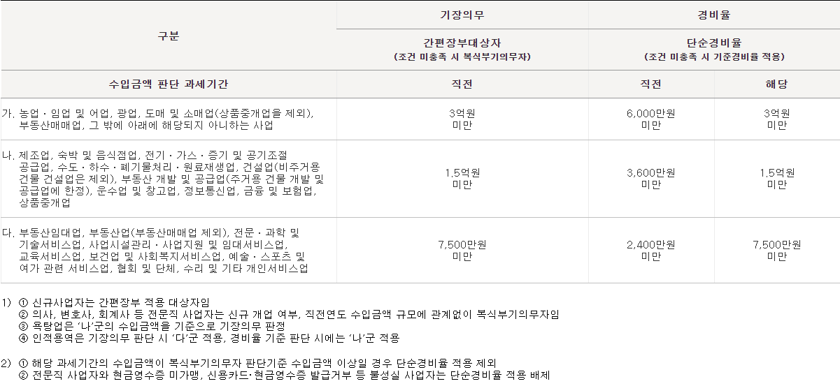 업종별 수입금액 기준에 따라서 기장의무와 경비율이 적용됩니다